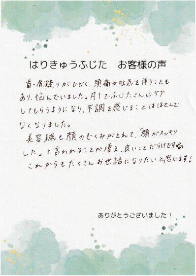 首・肩凝りがひどく、頭痛や吐気を伴うこともあり、悩んでいました。月1でふじたさんにケアしてもらうようになり、不調を感じることはほとんどなくなりました。