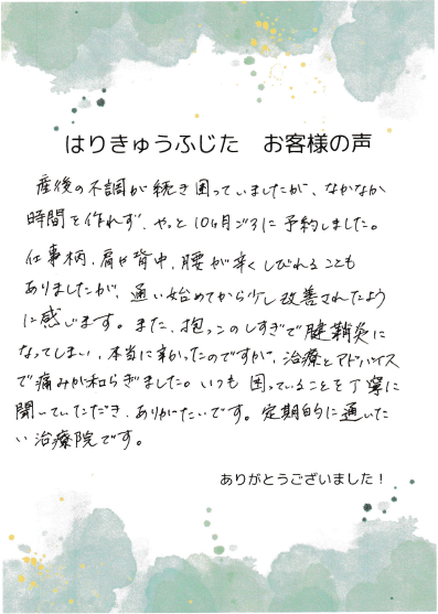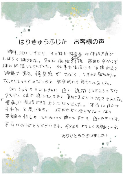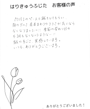 はりきゅうふじたさんに通い施術してもらううちに、少しずつ体が楽になってきて動けるようになってきました。「普通」に生活できるようになりました。本当に助けられたと思います。何だかよく分からない体の不調の訴えもていねいに聞いて下さり、通いやすいです。