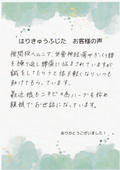 椎間板ヘルニア、坐骨神経痛やぎっくり腰を繰り返し腰痛に悩まされていますが、鍼をしてもらうと体も軽くなりいつも助けてもらっています。