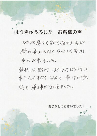 ひざが痛くて診て頂きましたが針の痛みもなく安心して受ける事が出来ました。
