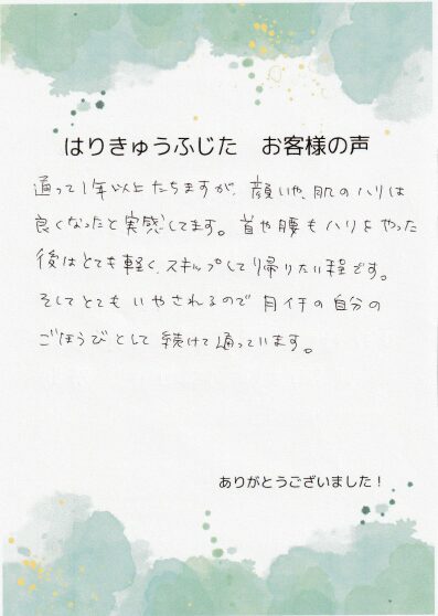 通って1年以上たちますが、顔いや、肌のハリは良くなったと実感してます。首や腰もハリをやった後はとても軽く、スキップして帰りたい程です。
