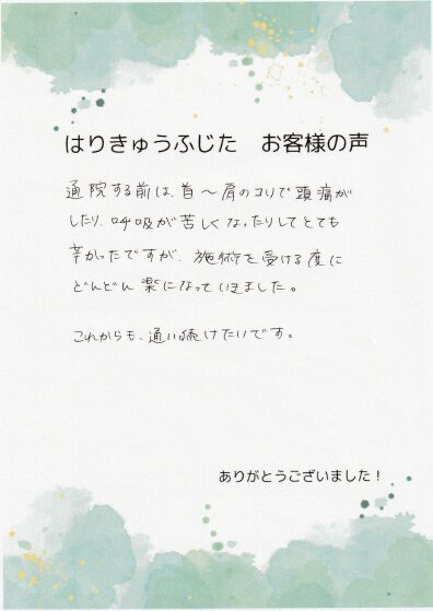 通院する前は、首〜肩のコリで頭痛がしたり、呼吸が苦しくなったりしてとても辛かったですが、施術を受ける度にどんどん楽になっていきました。